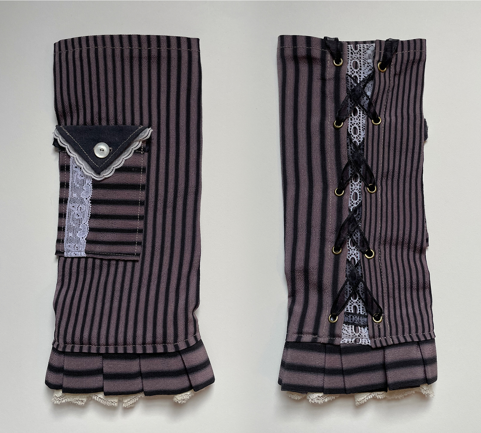 vintage kimono fabric, linen, lace, brass grommets, and ribbon lacing